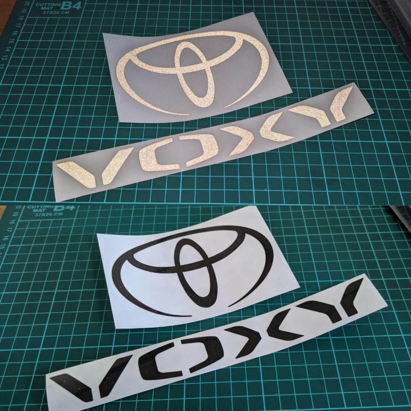 ヴォクシー80系のリアトヨタマーク、ヴォクシーロゴの表面に貼り付けるカッティングステッカーのセットです。